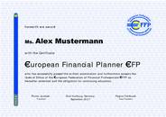 €uropean Financial Planner €FP®![]() Nach erfolgreich abgelegter Prüfung zum Finanzplaner und mindestens dreijähriger Erfahrung im Finanzdienstleistungsbereich und einjähriger Erfahrung in der Finanzplanung, besteht die Möglichkeit, das Zertifikat zum €uropean Financial Planner €FP® zu erwerben.